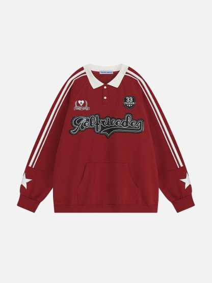 This bold polo sweatshirt combines classic tracksuit elements with delicate applique and embroidery details. The striking 'Aelfriceden' design and badge embellishment add a retro schoolyard vibe, while the contrasting collar and striped sleeves give it a sophisticated look.