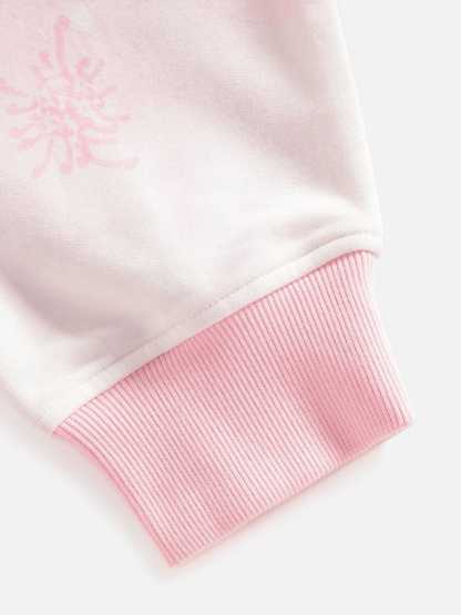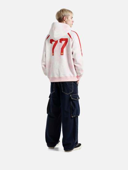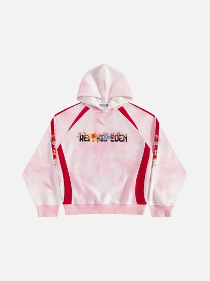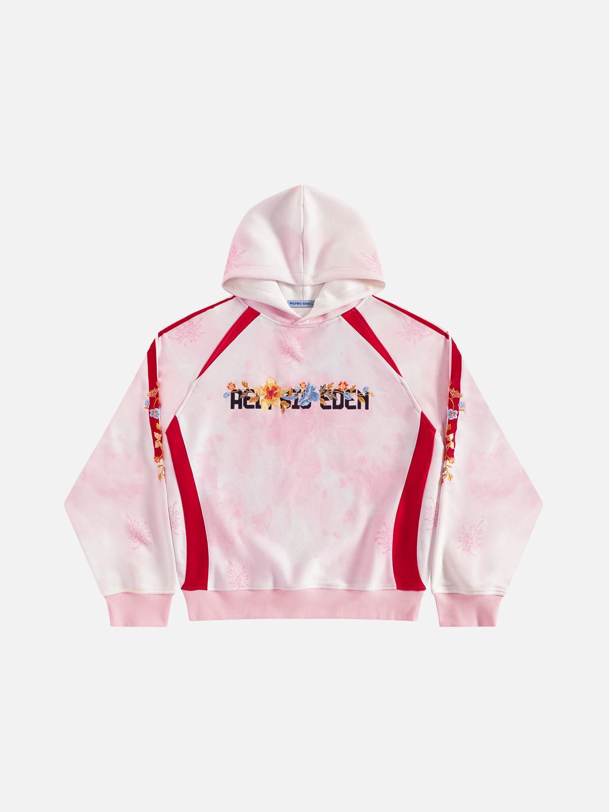 Crafted in soft cotton blend fabric, this hoodie features a unique color-block design accented with floral graphics, symbolizing vitality and renewal. The front is detailed with the Aelfric Eden logo surrounded by blossoms, while the back showcases a striking “77” graphic with star accents, evoking the spirit of a celestial jersey.