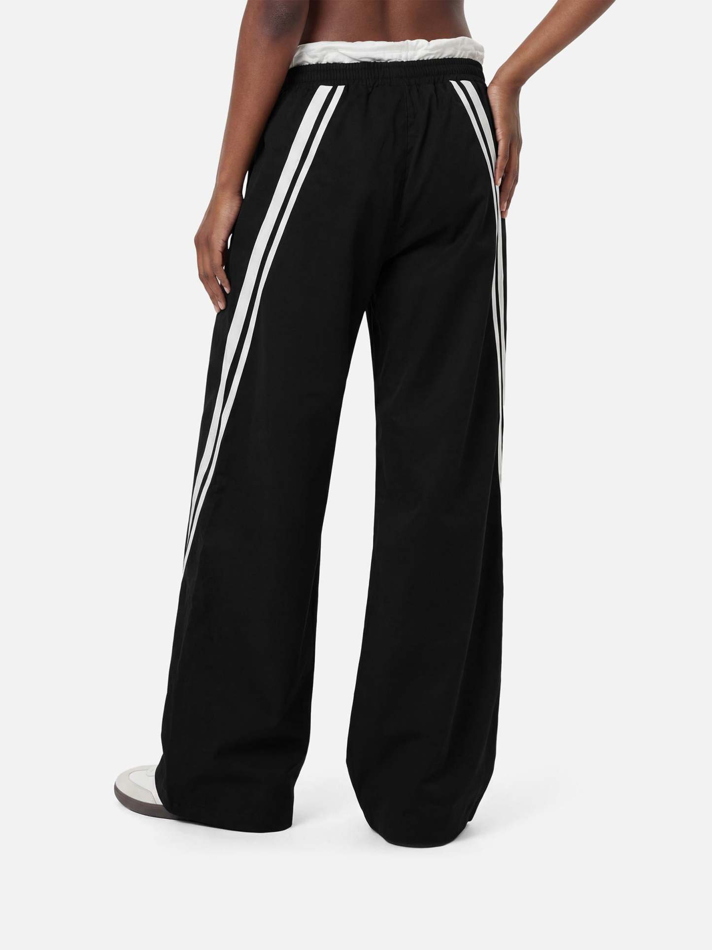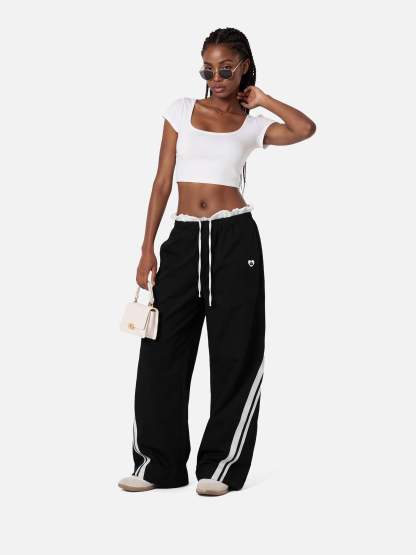 Step into layered detail with these black and white contrast sweatpants featuring a unique double waistband design. The illusion of two waistbands adds depth and attitude, while the bold monochrome blocking keeps the look sharp and graphic.