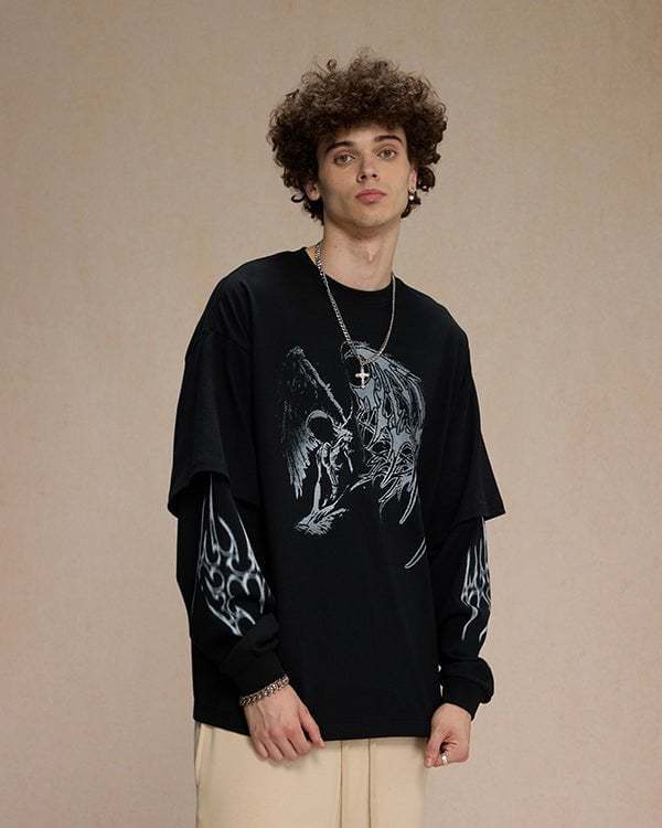 • Design: Angel vs. demon wing print on the chest, gothic-style sleeve graphics, and a layered effect for extra dimension.