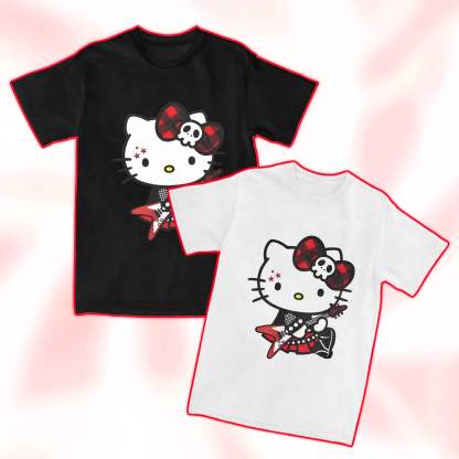 This unique t-shirt showcases Hello Kitty in a punk rock look—complete with skull bow and crossbones—blending sweet charm with bold attitude.