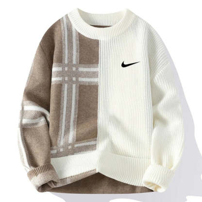 A two-tone panel design with subtle plaid detailing adds a clean, contemporary look to this knit sweater.