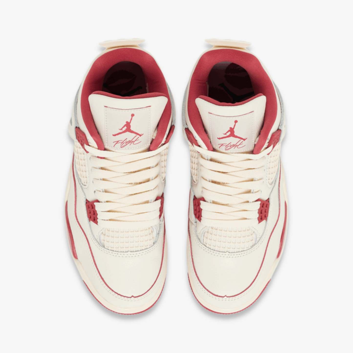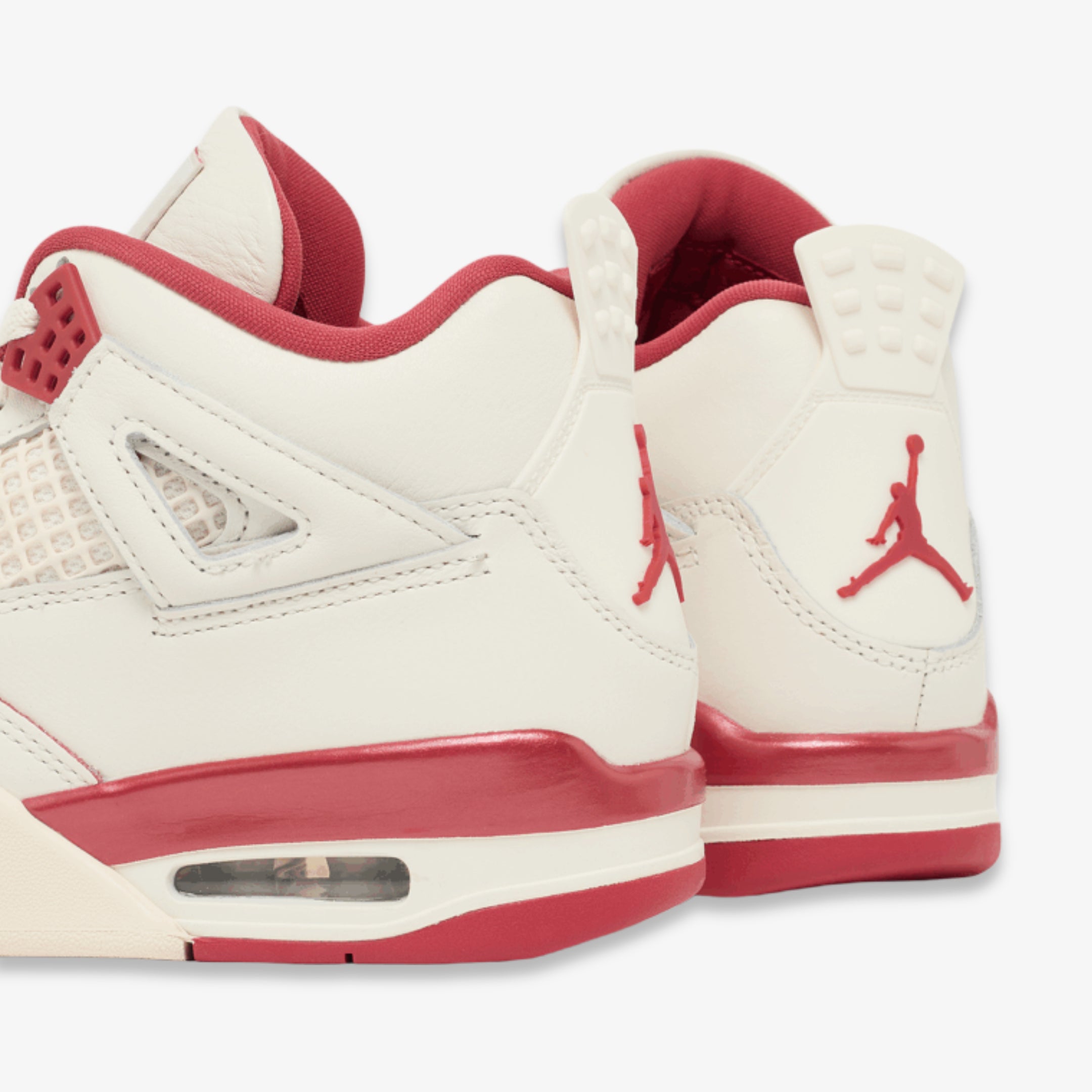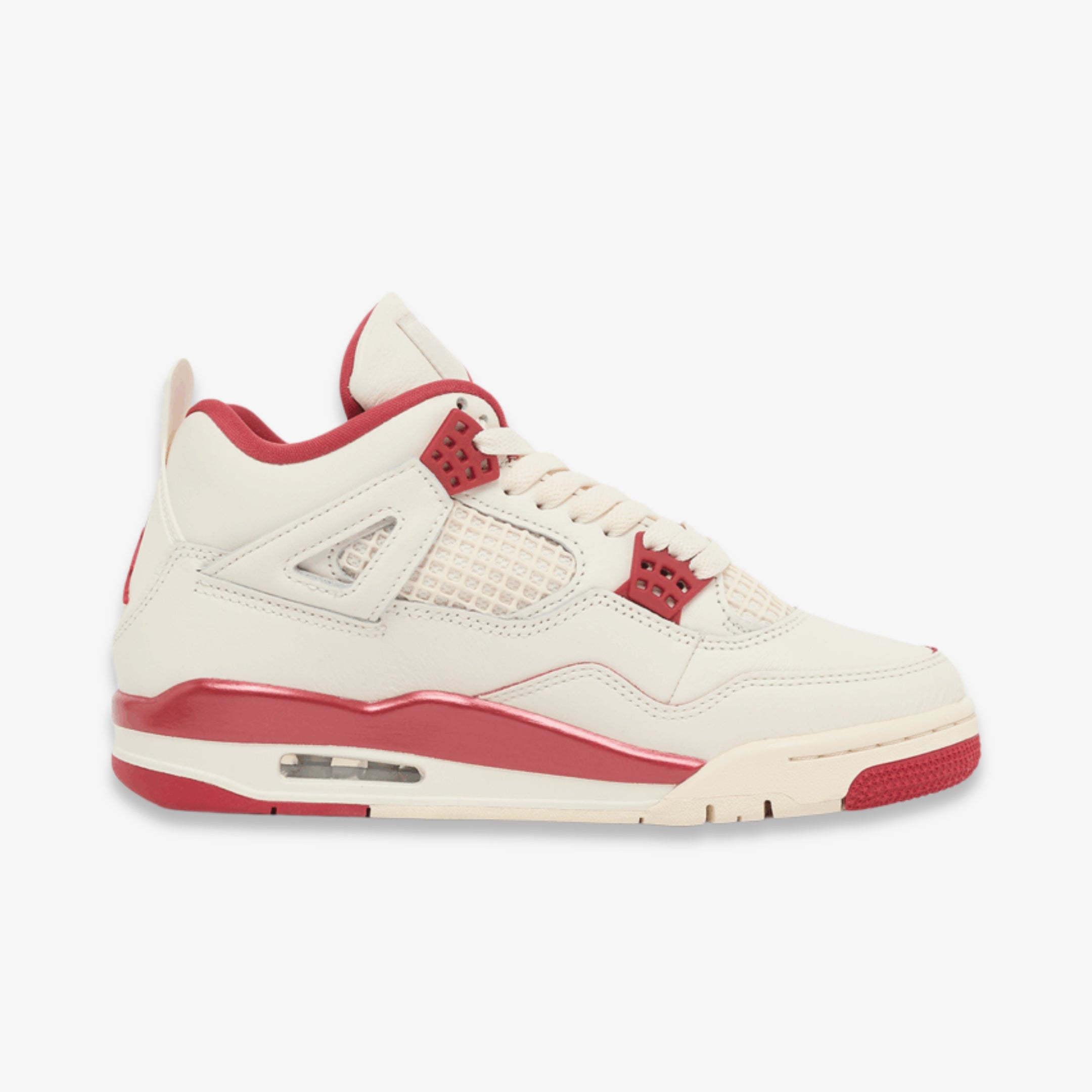 This pair features a crisp pale ivory leather upper, accented by bold Sierra Red elements on the lace eyelets, mesh underlays, sockliner, and Jumpman branding. A glossy midsole treatment evokes the sheen of lipstick, reinforcing the Valentine's Day inspiration. Inside, oversized red kiss prints decorate the insoles and the tongue lining, creating a playful, love-themed motif.