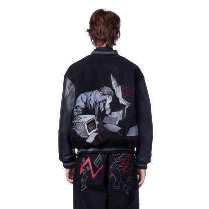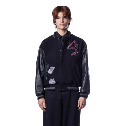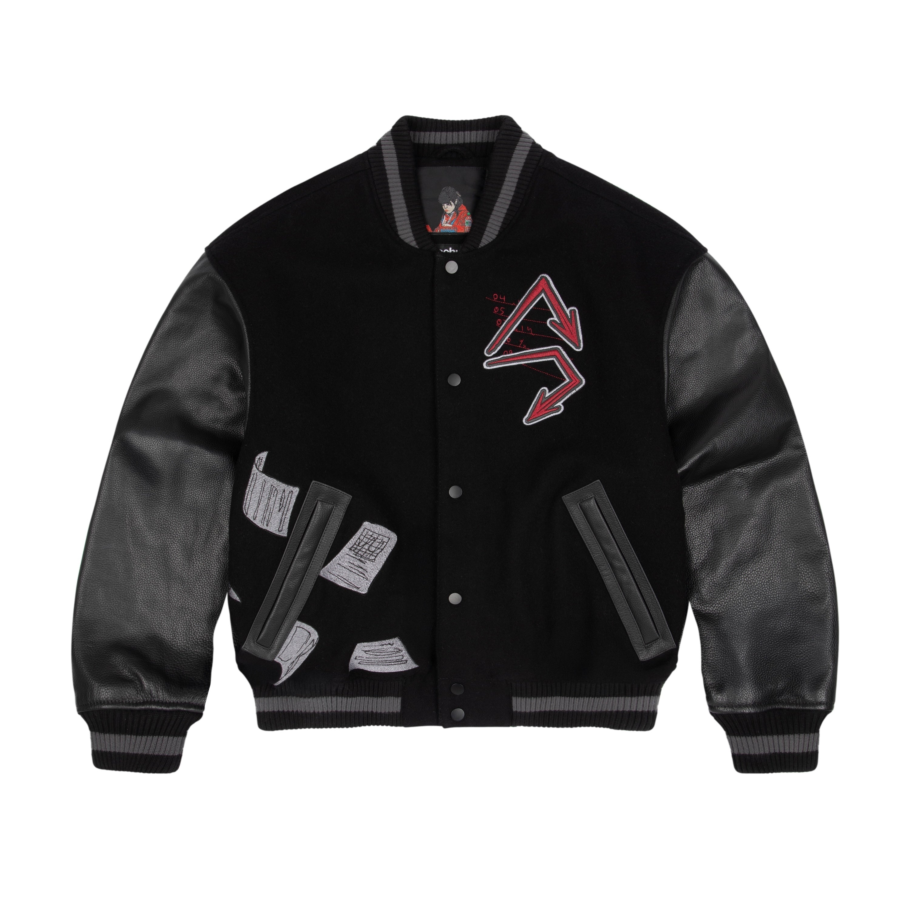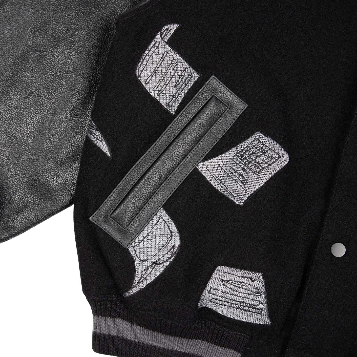 wool fabric / 100% plain leather sleeves / polyester lining / ribbed hem and cuffs / embroidery on front and back / leather appliqué embroidery on front chest / with YKK zipper / fits true to size