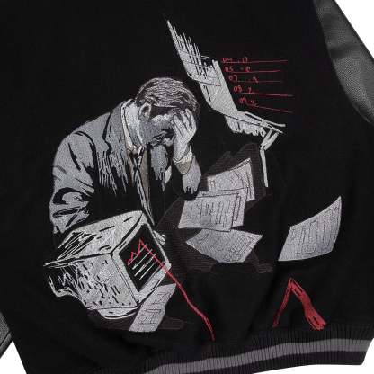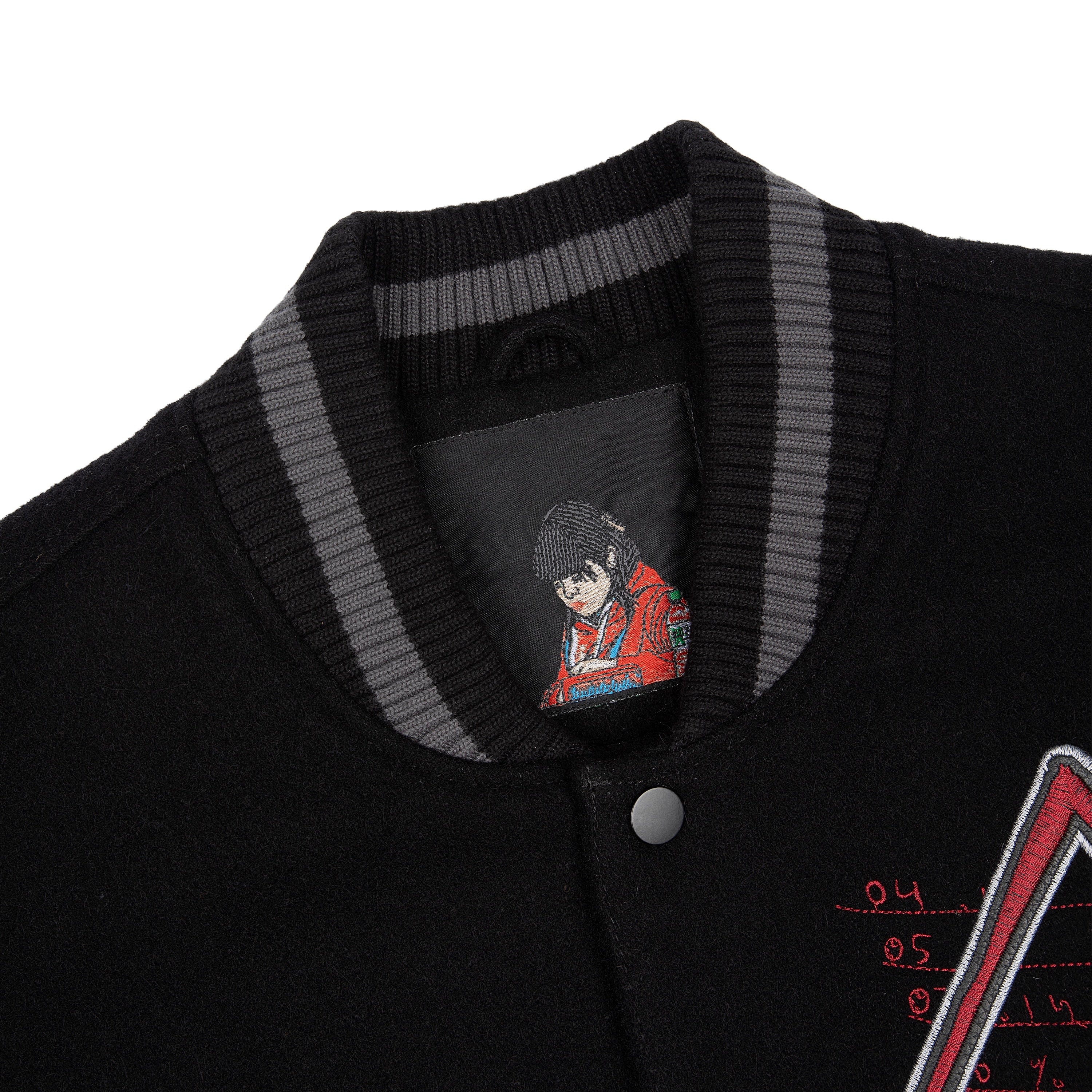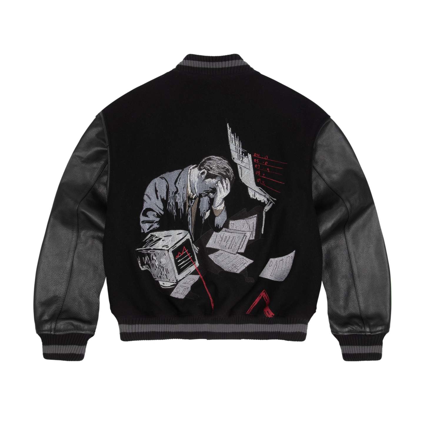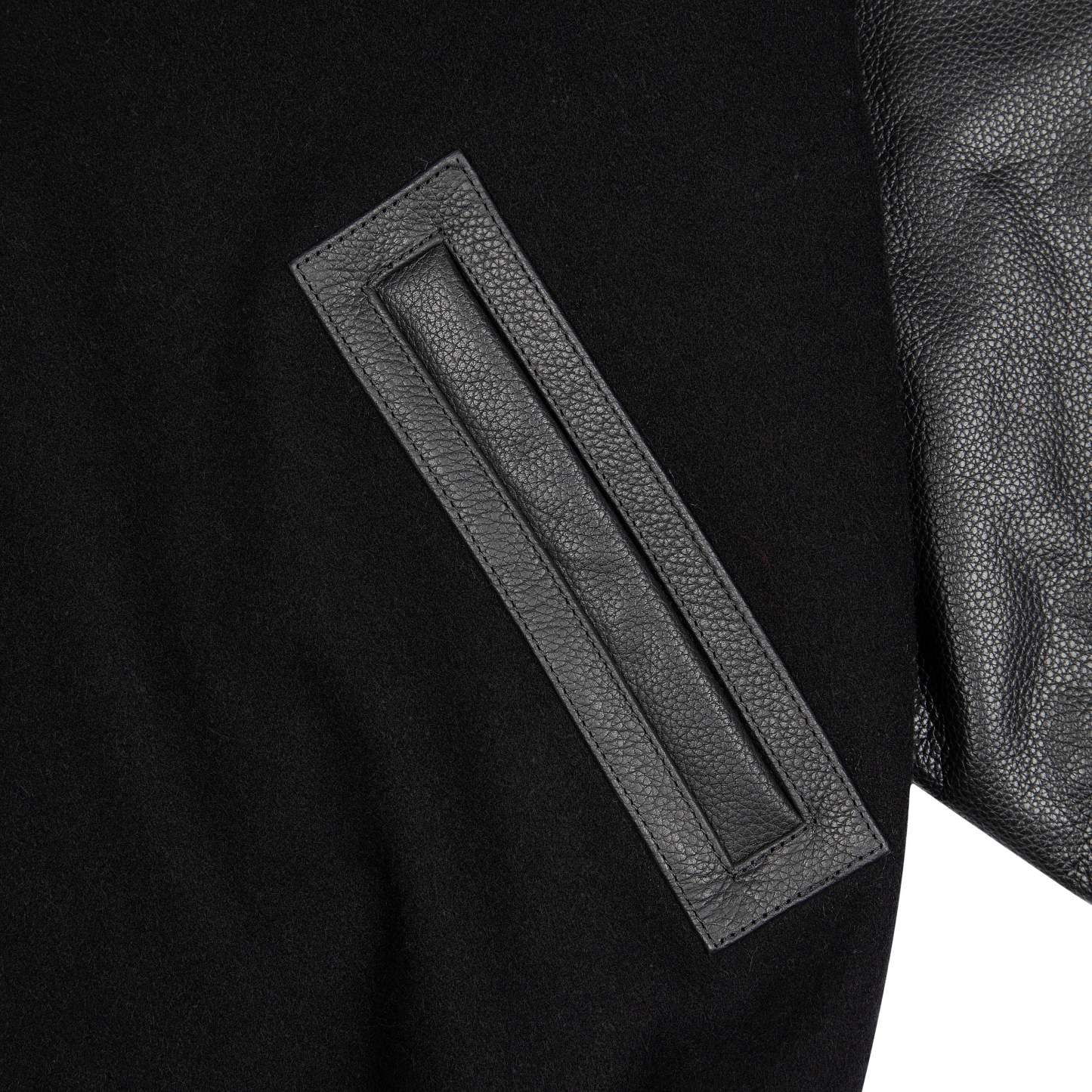 wool fabric / 100% plain leather sleeves / polyester lining / ribbed hem and cuffs / embroidery on front and back / leather appliqué embroidery on front chest / with YKK zipper / fits true to size