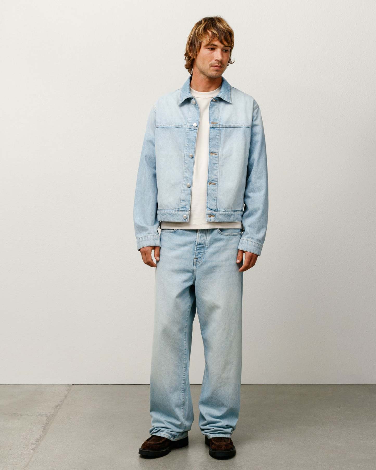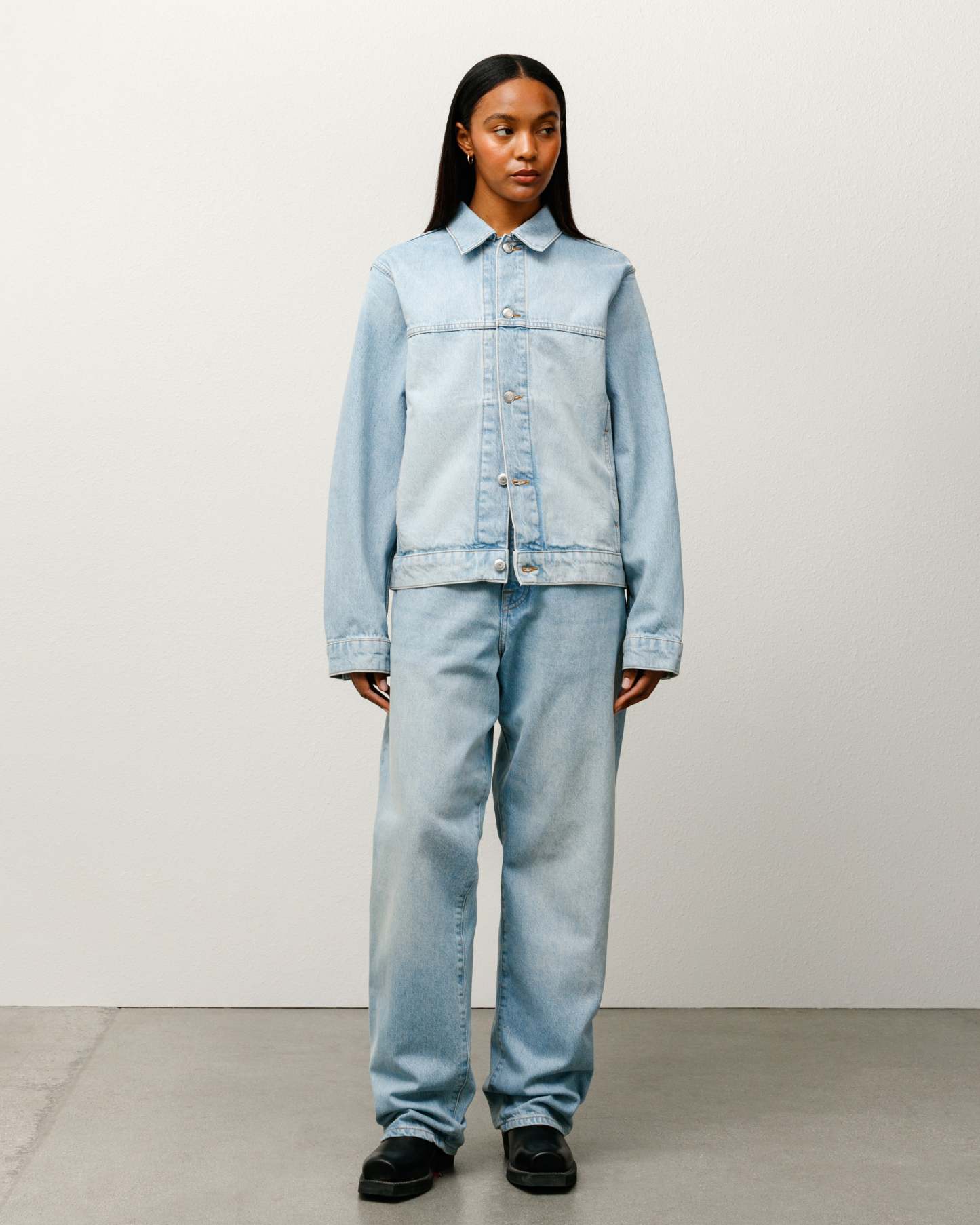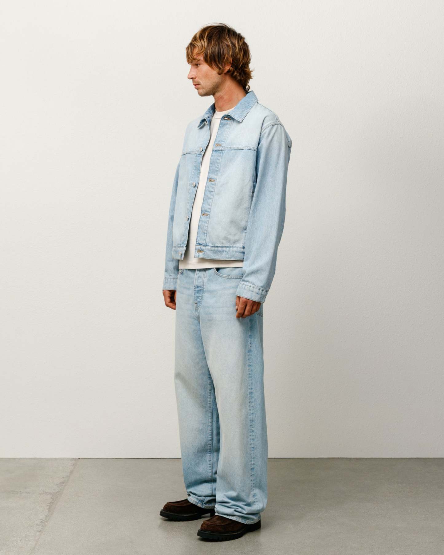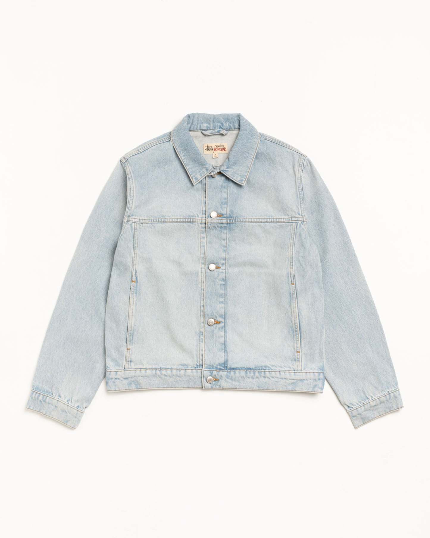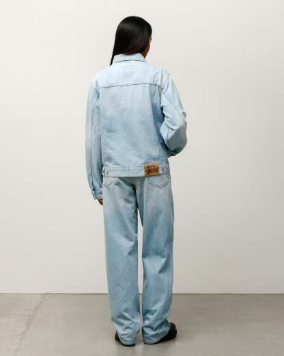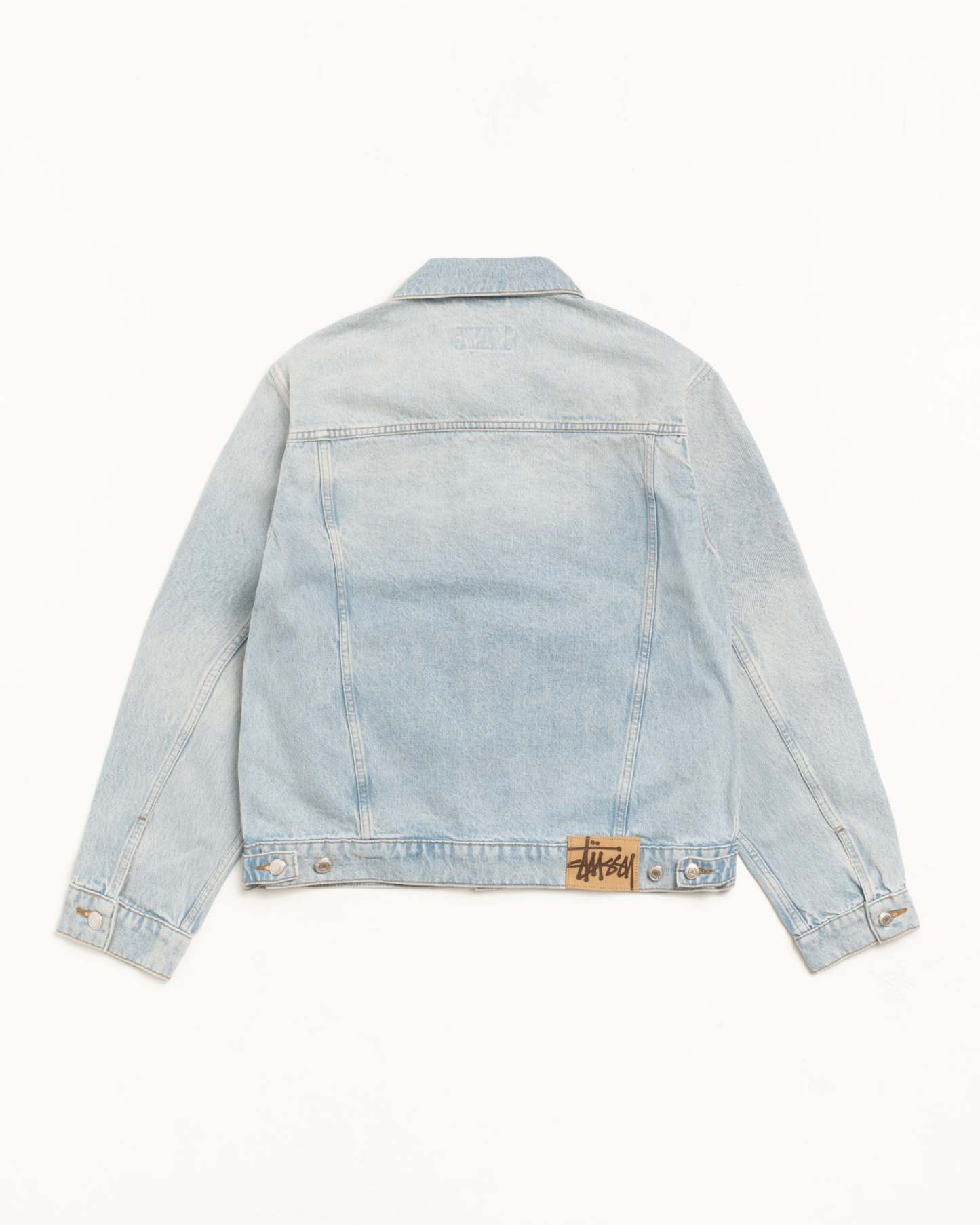Boxy cut with branded nickel shank hardware, gold topstitching and a suede Stüssy logo patch