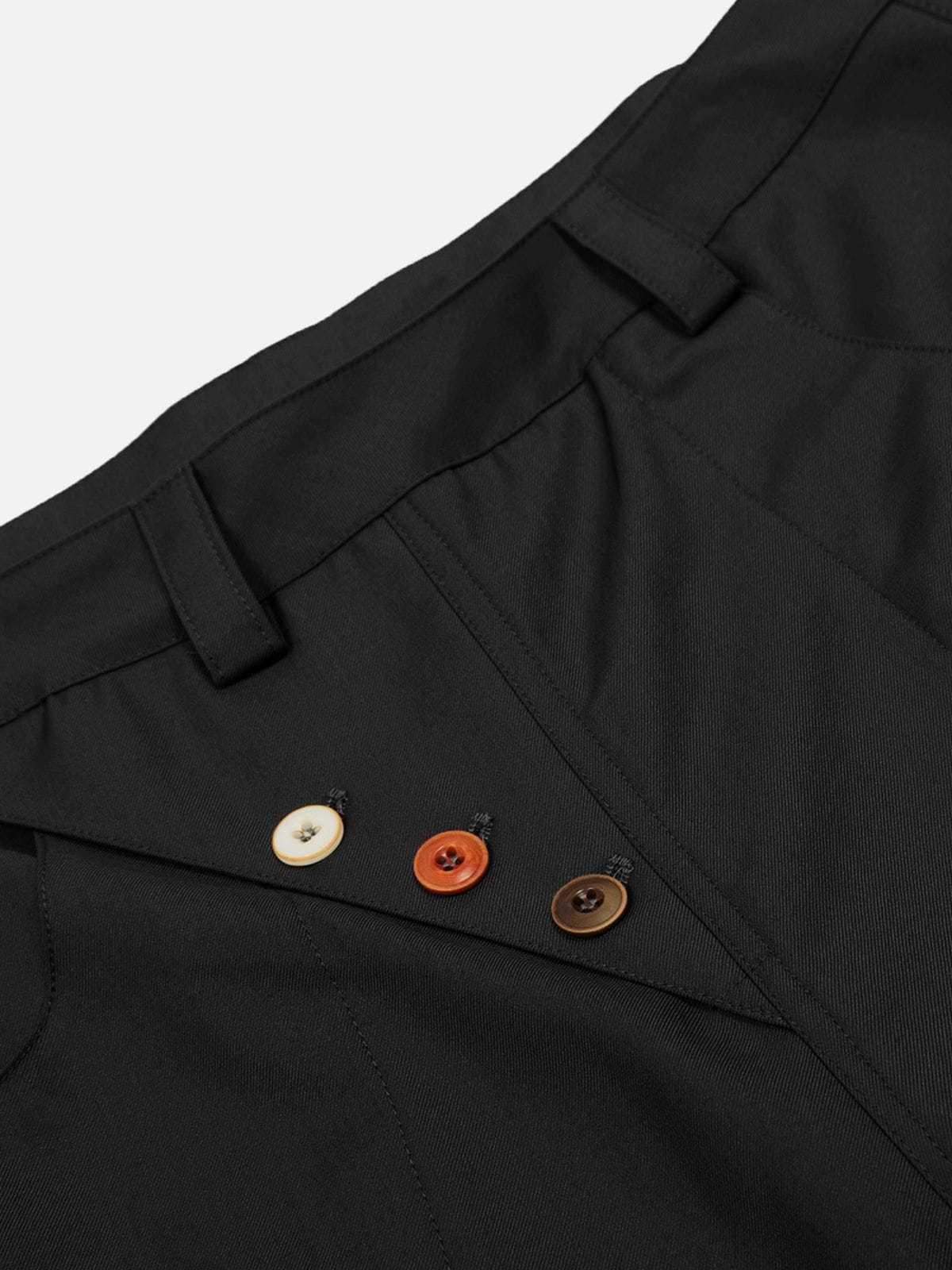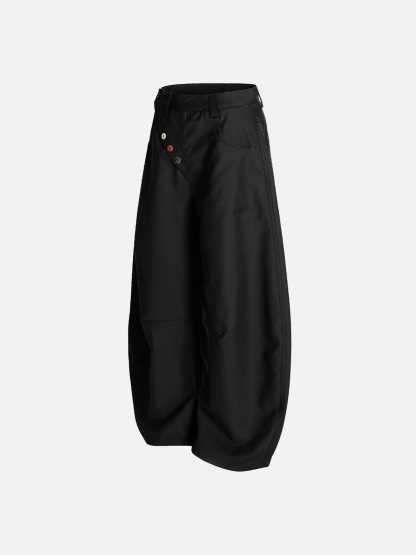 These eye-catching barrel pants feature oversized colorful buttons and a voluminous silhouette that blends streetwear edge with playful retro vibes. The unique baggy barrel cut offers dramatic volume while maintaining wearability through strategic tailoring.