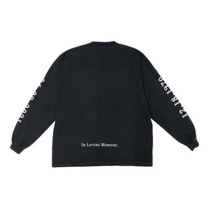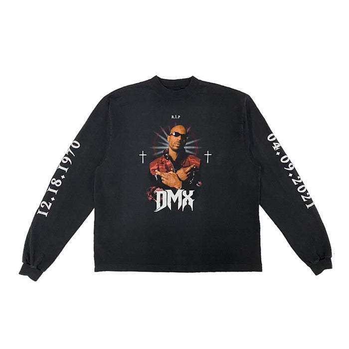 This retro-style long sleeve tee features an original DMX screen-printed portrait artwork on the front with “12.18.1970” printed on the right sleeve, “04.09.2021” printed on the left sleeve and “IN LOVING MEMORY” at the rear. The heavyweight cotton, oversized fit tee is treated with a vintage wash for a worn-in faded black look and feel.