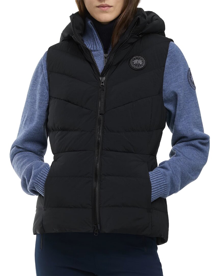 Introducing the Canada Goose Clair Vest, a must-have addition to your outerwear collection. This black quilted vest features a removable hood, patch logo at the chest, and two front zippered pockets for added convenience. With a zipper front closure and lightweight design, this vest is perfect for layering in cooler weather.Crafted from high-quality materials, the Clair Vest is made with a shell and lining of 87% polyamide and 13% elastane, while the fill consists of 90% duck down and 10% feather for superior warmth and insulation. Machine washable and made in Canada, this vest is as practical as it is stylish.Model is 5'9' and is wearing a size small. Please note that measurements may vary slightly by size. When you purchase from us, you can trust that our products are 100% genuine. While we may source items from trusted independent suppliers, we always guarantee the authenticity of every product sold on our site. Embrace adventure with Canada Goose and the Clair Vest today.