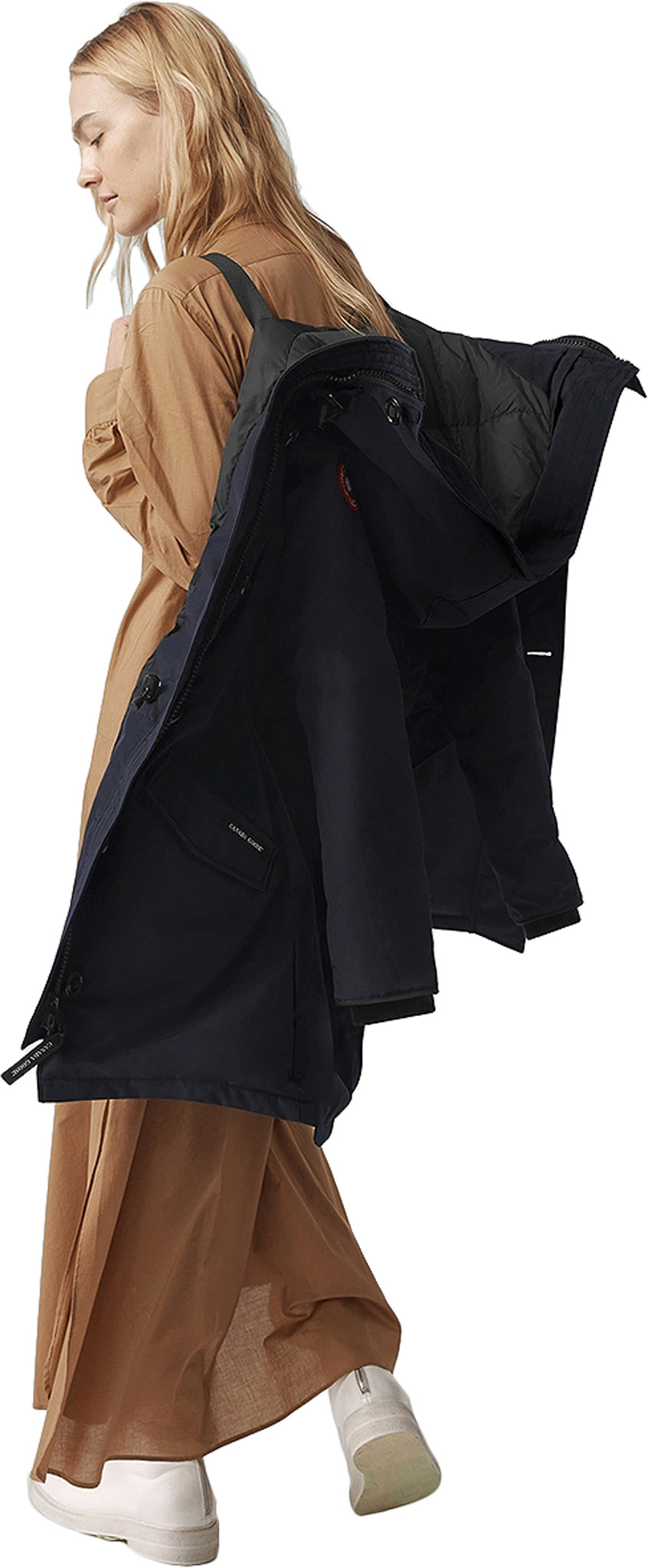 • Les courroies de style sac à dos intérieures permettent de transporter le manteau sur les épaules, sans encombrer les mains